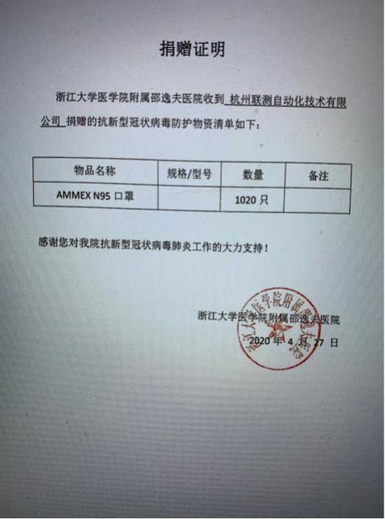 自新冠肺炎疫情爆發(fā)以來,杭州聯測自動化有限公司累積向邵逸夫醫(yī)院捐贈1020只N95醫(yī)用口罩,為當地的抗疫一線的醫(yī)護人員提供一份保障。