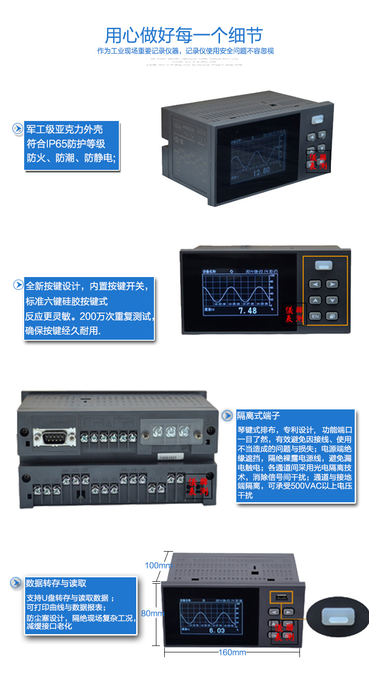 SIN-R200D系列無紙記錄儀可自由組態(tài)輸入標準電流、標準電壓、熱電偶、熱電阻、頻率等信號,可實現(xiàn)為傳感器配電和繼電器報警輸出,并且可通過U盤或通訊方式與上位機進行數(shù)據(jù)交換。無紙記錄儀 本身具有實時數(shù)據(jù)顯示畫面、曲線顯示畫面以及棒圖數(shù)據(jù)顯示畫面,同時,可以與微型打印機相連 接,實現(xiàn)現(xiàn)場打印功能,與聲光報警器連接,實現(xiàn)現(xiàn)場聲光報警功能。